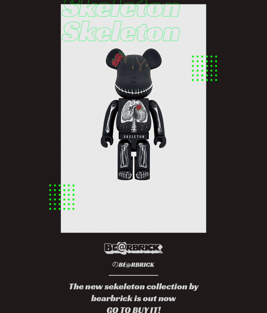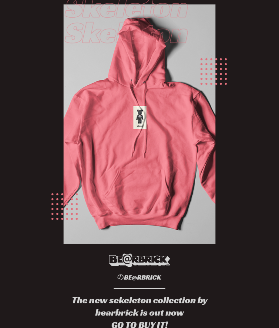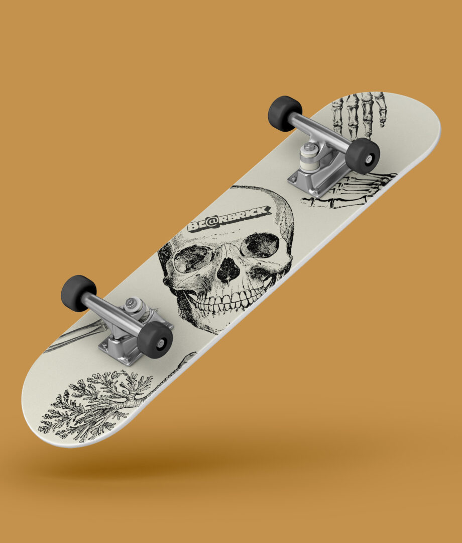 Bearbrick, progetto personale per la creazione di una nuova linea di abbigliamento dedicata al mondo degli skater. Dopo una profonda indagine ho scelto di mettere in risalto i punti più esposti degli skater ovvero le ossa, quello che mettono a rischio per rappresentare la loro identità e il loro sport fino in fondo. Sono state create magliette felpe e grafiche per skateboard oltre alla promozione pubblicitaria.